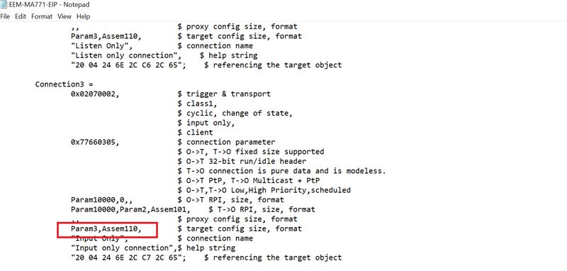 Open the EDS file, and search for line "Param3, Assem110," and change it for a double coma ",," as shown below: