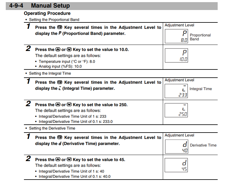 | P (Proportional Band) | Slower response, less oscillation | Too high: Sluggish response Too low: Overshoot, oscillation |