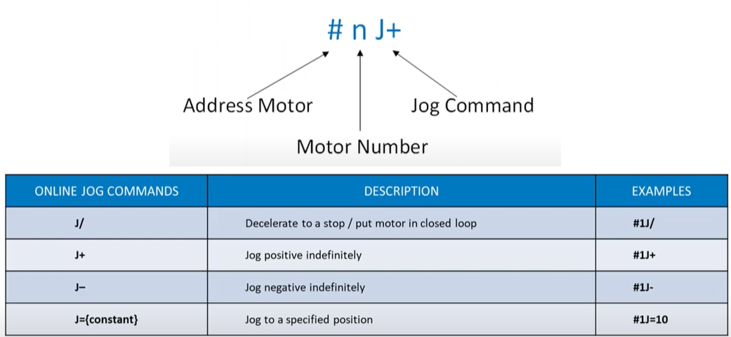 Online Jog commands syntax - All jog commands will close the loop on the motor before executing.