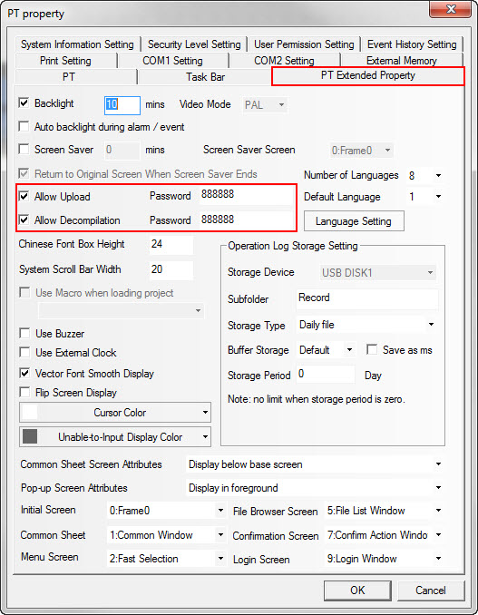 By default, both the upload and decompilation passwords are set. As a result, users must enter the specified password to upload a project from the HMI; Otherwise, project uploads will be blocked. The default password is 888888.